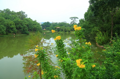 除黄钟花以外,在这美丽的华南植物园里,放眼望去,灌木的、开的不知疲惫的黄花比比皆是,荚果两个一组的双荚决明、荚果有翅的翅荚决明、花密集呈半球形的黄龙船花、花苞形似蝉蛹的黄蝉花等等,大有秋花更比春芳魅之势。这些花儿就好像邻居小孩,我们呼吸着同样的空气,看着它们从小到大,习以为常。忽然一个转身,被深深触动,在华南植物园彩虹桥边,秋晴的阳光下,黄钟花绿树黄花倒影在水中,鱼戏浅底,顿时一幅绵延的山水画从心中蔓延。秋光冉冉,岁月匆匆,风景无处不在,在感叹时光飞逝的同时,或许我们最该留意的是生活中凡常的美好。