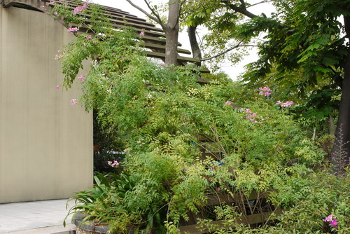 非洲凌霄(Podranea ricasoliana)是紫葳科非洲凌霄属木质藤本,顾名思义来自非洲,又名紫芸藤,茎干白色,对生奇数羽状复叶,花淡紫红色,花冠内有紫红色脉纹,喉部白色或浅粉色,花冠下面具有长腺毛,花瓣边缘有细柔毛。非洲凌霄,柔枝纤蔓,碧叶秀花。