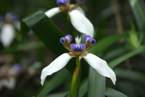 巴西鸢尾Neomarica gracilis,为鸢尾科多年生草本植物,原产墨西哥、巴西等地,又名马蝶花、鸢尾兰、玉蝴蝶。其叶片带状剑形,基部扁平,花自花葶顶端的苞片内开出,花被6枚,外轮3枚开展,白色,内轮3枚卷曲,蓝紫色,花被内面近基部具褐色斑纹。