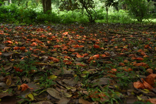 落于树下的火焰之花,火红尤在,燃烧已再无力,也罢,绽放过了,横竖也是走过青春一场,他日碾作尘泥,更护来年之花!