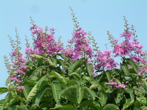 劳氏紫薇Lagerstroemia loudonii,千屈菜科紫薇属常绿乔木,花开得稍早,其叶椭圆形,被毛,侧脉每边7-11条。圆锥花序顶生枝顶,花淡紫色至淡蓝紫色,花瓣6枚,边缘皱曲。