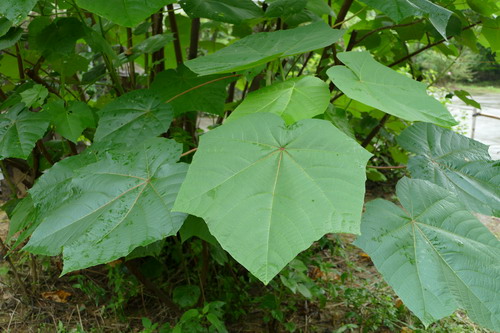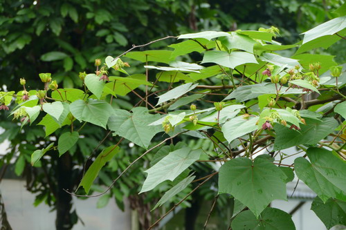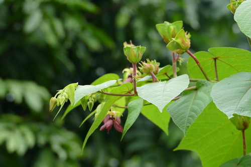 先看看它的叶子。其实花也好,果了罢,都在掩饰它的身份,唯有叶片说了实话,不经意它就暴露了它的锦葵科身份。你看它的叶片,是不是跟我们常见的木芙蓉呀,梧桐树呀叶片一样?其实在一种分类系统里,它是被划入梧桐科的。