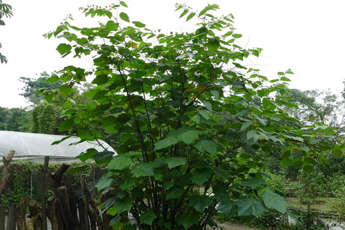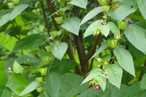 昂天莲是莲么?当然不是,它种在华南植物园生物园,跟朱槿、木槿、木芙蓉共居一室,当然就是锦葵科的货了。昂天莲(Ambroma augustum (L.) L.f.),锦葵科昂天莲属灌木,又名鬼棉花、仰天盅、水麻和假芙蓉。大家都知道,锦葵科的物种大部分开的花都是高昂着头的,这里的“昂天”说的是它的花么?偏不!这里说的是它的果实,昂天莲的蒴果膜质,具五条纵翅,成熟时,舒展开像一朵盛开傲立挺拔的莲花。从侧面看,这果实又像如同一个个杯子,又有人称之仰天盅。它非同寻常,它的拉丁名是Ambroma augusta,其中种加词augusta就是“庄严的,值得注目的”意思。