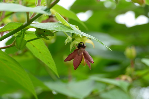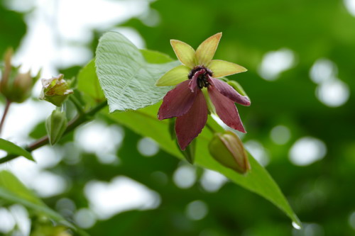 生物园是我每次光临华南植物园必到之处,这里栽培的大都是锦葵科和爵床科植物,偏偏都是我最喜欢的货。经过我一次次“扫荡”,依旧还有“漏网之鱼”,正如昂天莲,在我四月初的那次“洗劫”中,居然逃过了我的掌心,趁“五一”小长假路过广州的机会,专为它跑了一趟。 熟悉的路线,熟悉的场子,不费吹灰之力就找到了它,原来,它就是我平常路过正眼也不瞧的那大株灌木,如今的它,那可是光彩夺目。这会,既有低垂的花儿,又有昂首的果子,一举一垂,刚柔并济,相得益彰。你看那花,五片紫红色的花瓣张开围在一起,就像最新款式的短裙,随风飘曳,而那些果子,挺立在枝头,犹如正被检阅的步兵,整齐划一,巍然不动。而那宽大而碧绿的叶片,就像是它们的主场。
