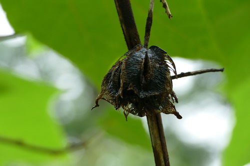 不过很快它很快就会变成黑褐色,且花的内部呈棉絮状,如棉花一般,长得十分奇葩,因此农民朋友也称它为“鬼棉花”。让很多人操心的是这个果实一直高昂着头,它的种子岂不是藏在里面,直到腐烂?才不会,虽然你聪明,可植物一直不笨,它自有其生存之道,待果实完全成熟之时,它又会再次翻转,化作一个个倒挂的灯罩,将种子散播出去。