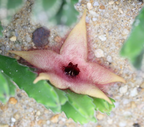言归正传继续说花朵。花1-3朵从嫩茎的基部长出,花苞由小米粒大小慢慢长到有个小橘子那么大,开始花苞的棱边凸起来,颇有几分骨感,慢慢地不再长大只是越来越鼓,变成一个鼓鼓的小气球样,脾气也有点象气球,充气太满就要爆啦——花儿慢慢裂开盛放!盛开的时候花朵直径可达15-20厘米,花瓣5片,呈五角星形,外形象一只海星,所以也有叫海星花的。花瓣上有细腻的豹纹,密布细毛,毛茸茸的豹纹可爱极了。