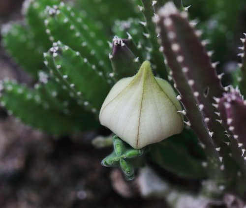 和大多数多肉植物一样,大花犀角开花的时候不多,平常多数时间看到的是一抹绿色。丛生刚劲挺拔的肉质茎看起来象袖珍的森林,也象俊秀的山脊峰林,摆在书桌案头是一个很好的装饰绿植。也可以放在假山缝隙或院子里的某个角落,不需要太多土,要求疏水透气就好,外出十天半月不浇水也没问题,当你推门进家的时候依然给你一抹翠绿。在广东地区养殖过冬完全没障碍,春节一过就开始长新枝,有新枝就会长花苞,每年能开几趟花。夏天气温高的时候慢慢进入休眠状态,等秋凉了又会长一轮新枝、开一趟花。这是一种需要放寒暑假的植物。