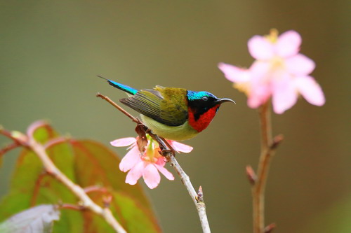 叉尾太阳鸟(ethopyga christinae),是太阳鸟科一种体型非常小而纤弱的鸟,体长10厘米左右,体重5-7克。它们的嘴细长下弯,舌呈管状,专门用来吮吸花蜜,因此又被称为“亚洲蜂鸟”。
