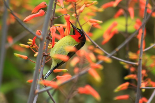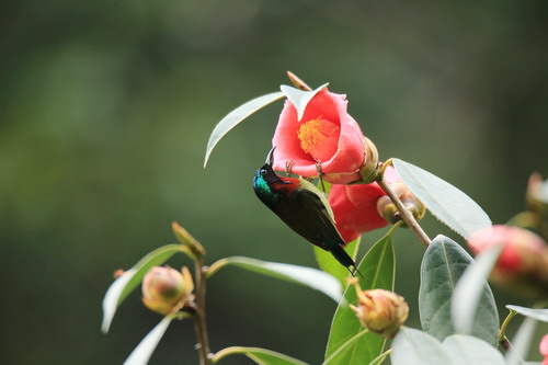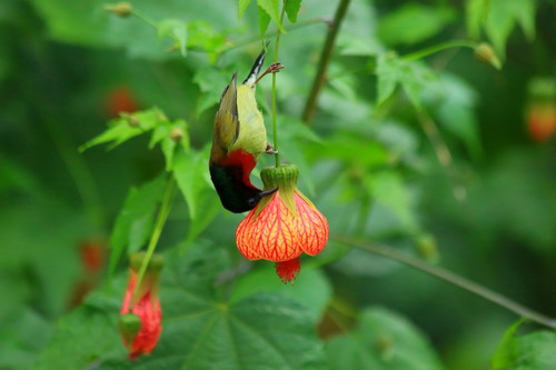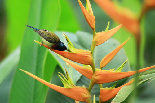 最近几年华南植物园内的叉尾太阳鸟明显增多,因为园内增加了蜜源植物的种植,尤其是叉尾太阳鸟喜欢的蜜源植物,有效地吸引了叉尾太阳鸟等野生鸟类和蝶类在园内繁衍生息,营造了花鸟昆虫等生物多样性的生态环境。