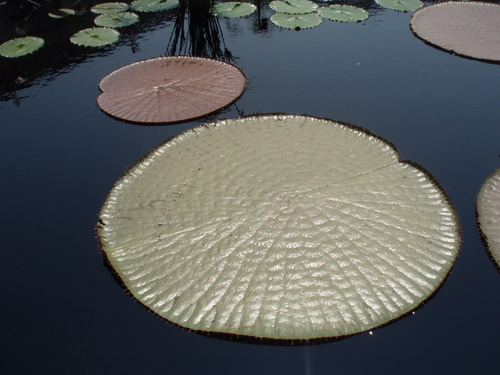 王莲是水生有花植物中叶片最大的植物,有“水上花王”的美誉。其初生叶针状,长至2-3片时矛状,4-5片时戟形,6-7片叶时完全展开呈椭圆形至圆形,叶缘直立上翘呈盘状,像数个大圆盘浮于水面,直径达1.5m以上。由于王莲的叶子背面布满了由中心向四周放射状的粗壮叶脉,叶脉内部具有特别发达的通气组织,里面储藏大量的空气,使得每片叶子浮于水面,可承重数十公斤的重量,因此小孩子坐在叶盘上面也不会下沉。多年连续生长的王莲叶片更大、占据极大的水域面积,可达十数乃至几十平方米,非常壮观。