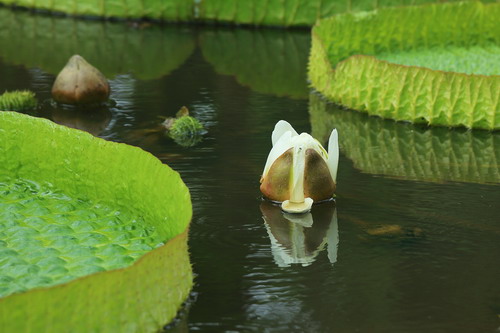 王莲娇艳的花朵在水面绽放,一株王莲即可形成异常美丽的生态水景,让人赞叹。王莲一般傍晚时分花葶伸出水面绽放,花大,直径达20cm-30cm,花瓣多数,初开时白色,香气浓郁,第二天清晨花苞逐渐闭合。傍晚时分再次开放,花瓣则变为淡红色至深红色,花瓣反卷,至第三天上午呈红色并沉入水中。由于颜色多变因此赢得了“善变女神”的美誉。