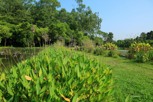 虽已过立秋处暑,广州还是炎炎夏日啊,一点凉快的意思都没有。夏天可是水生植物开花的季节。前一阵子介绍的莲花(荷花)的花期基本过了,现在有莲蓬了,残荷莲蓬也是别有一番意境。而前几天介绍的王莲正是花期,预计还能持续一段时间。各色睡莲则不知疲倦几乎全年肆意绽放,让水面格外艳丽。今天我们还要来介绍两款花期也特别长的水生植物——再力花和垂花再力花。正因为有了这些水生植物,夏季的湖面才显得如此妖娆多姿。