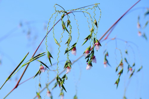 垂花再力花细丝状的花亭,一根根高高的挺出叶面,延伸出植株2倍高度。蝶状花朵倒挂在之字形的花梗下,在微风中轻轻晃荡,姿态飘逸,像身手不凡的杂技师在做高空舞蹈。与再力花相比,垂花再力花植株更为高大,花序下垂、耐寒性较差。