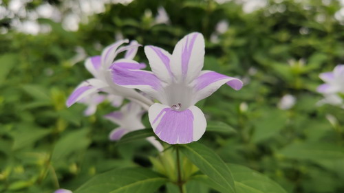 双色假杜鹃(Barleria cristata ‘Lavender Lace’),又名条纹假杜鹃,为爵床科假杜鹃属假杜鹃(Barleria cristata L.)的栽培品种,这种常绿小灌木高约1米;茎圆柱形,被柔毛;叶对生,叶片长椭圆形至狭卵状披针形;聚伞花序顶生或近顶端腋生,苞片、小苞片边缘刺齿状,花冠管筒状,花瓣紫白相间,花形奇特,开花时宛如一个个欢歌的小喇叭,美丽动人。