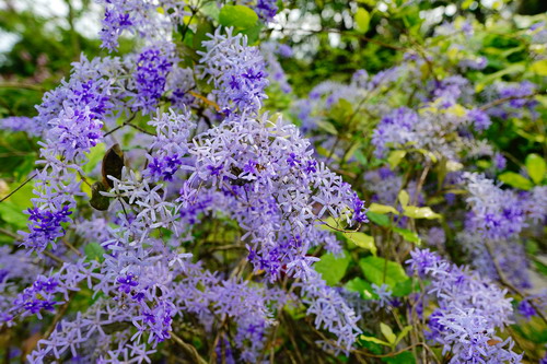 值得一提的是,蓝花藤的萼片掉落后收集起来还可以做花环,在国外也称之“紫色的花环(Purple Wreath)”或“皇后的花环(Queen's Wreath)”。