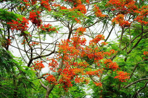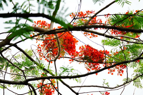 凤凰木“登陆”这片大陆后,发现这里的天气与它原产地的生活环境非常相似,因为有它喜欢的高温湿润和光照充足的环境,于是就住了下来,开枝散叶,繁衍生息。每每夏季,凤凰花无疑就是南方地区当仁不让的“网红”。它也确实很红,被誉为世界上色彩最鲜艳的花朵之一。