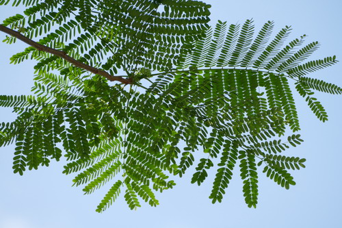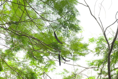 除了花,它的叶片也很美,在没花的日子,叶子就走上前台,撑起这片天。它的叶片由大约五十片小叶组成一片羽毛状的复叶,称为“羽片”,十五到二十对羽片在叶轴上对生,组成一个巨大的复叶,这就是典型的“二回羽状复叶”。文艺一点就叫它“叶如飞凰之羽”。