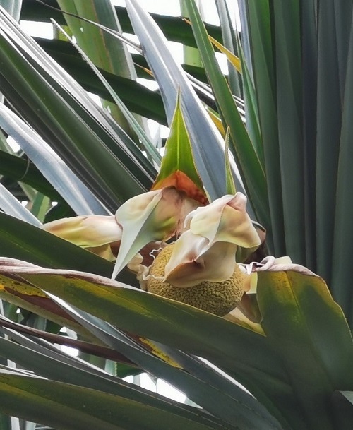 分叉露兜(Pandanus urophyllus )为常绿乔木,顶端常二歧分枝。叶革质,带状,长2.5-4米,叶缘具锐刺。雌雄异株,花序顶生下垂。雄花序复穗状,雌花序头状。聚花果椭圆形,成熟时红棕色,外形与菠萝相似,小核果顶端二歧刺状。分布于华南及沿海岛屿、西南。印度(锡金)、缅甸、越南等也有分布。分叉露兜在我园每年有开花结果。