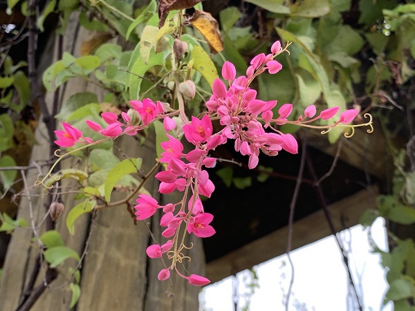 珊瑚藤(Antigonon leptopus Hook. & Arn. ),别名凤冠、凤宝石,因其花开时形似珊瑚而得名。是蓼科珊瑚藤属多年生攀缘状藤本,蔓长1-5米,基部稍木质。原产于中美洲地区,现我国南方地区广泛栽培。珊瑚藤开花夺目壮观,是园林和垂直绿化的好植物,也是有观赏价值的花卉之一,有“藤蔓植物之后”之美誉。珊瑚藤的花像一条项链一样串在一起,也被称为“爱的锁链”,其义正来自她的浪漫英文名——Love's Chain。这其中还有一个唯美的爱情故事呢。