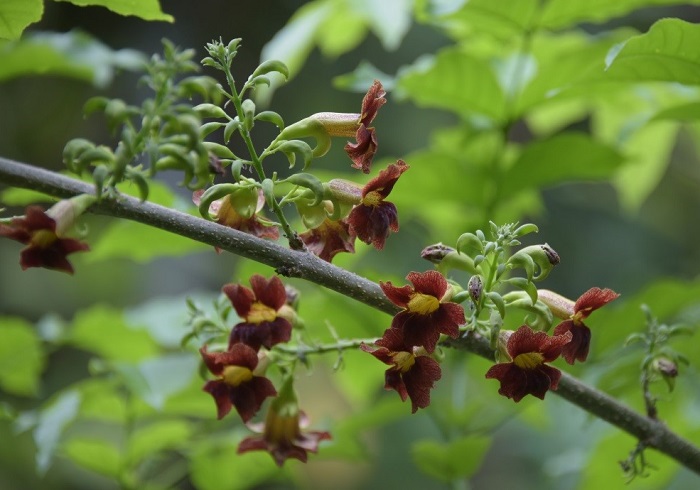 尖叶猫尾木的总状花序生于树枝上,花苞的模样像是鸟儿带钩的小嘴巴,花冠筒为黄色,花冠裂片5枚内面栗色,4枚雄蕊1枚雌蕊,花开过后留下挖耳勺一样的雌蕊伫立枝头。它引人注目的花朵,通常在5-6月绽放。一看它这开花的气质,估摸就能猜出它非同寻常。就像王熙凤见到黛玉说的那样如今出挑的美人一样的模样儿……这通身的气派……”