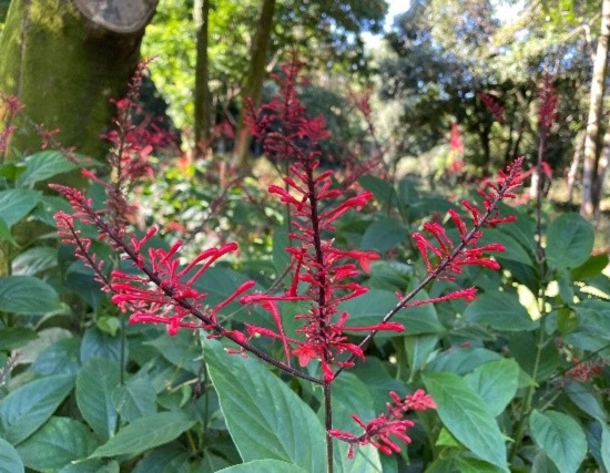 在杜鹃园的小径旁,大树下,有两丛植株正处于盛花期,红色花穗高高支起又稍散乱,它们同属于爵床科植物,是鸡冠爵床属的成员。