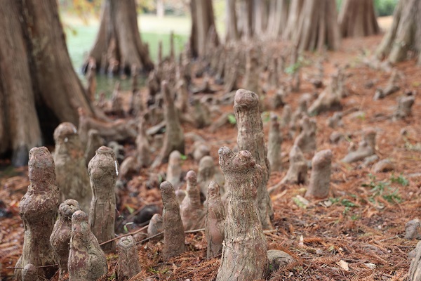观赏植物有的观花有的观叶,对于落羽杉来说没有花,不如我们直接来欣赏根。在落羽杉主根周围涌出高低错落的棕红色“膝状根”(knee)有的纤细,有的粗壮,有单体如奇石,有的成片好似佛陀聚会,可谓千姿百态,让无数初次见到的朋友们啧啧称奇。这种奇异的膝状根,只有生长在长期浸水的浅水中或近水的地方,而生长在排水好的平地或坡地则没有。关于膝状根的作用曾有不同猜测,认为是“呼吸根”,后来科学家测定膝状根呼吸效率的研究排除了“呼吸根”的说法。目前普遍的观点是膝状根能够起到支持作用。