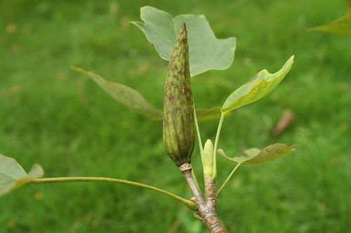 花谢后,鹅掌楸结出纺锤形的聚合果。果实未成熟时披着一件紧身的绿色外衣,酷似秋葵,成熟后外衣变成浅褐色并逐渐敞开,露出一个个插上翅膀的小坚果,这是木兰科中唯一的翅果。