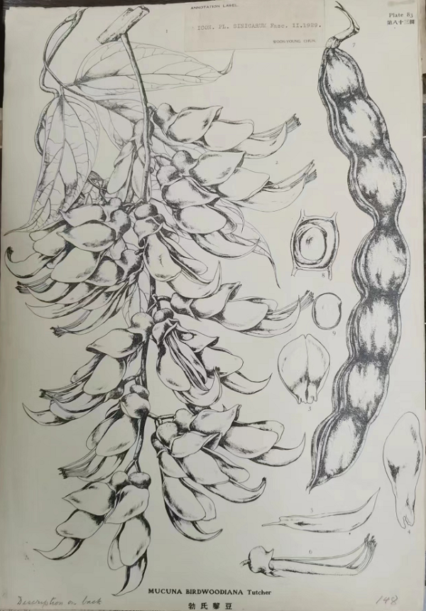 时光荏苒,时间来到了1905年,白花油麻藤的命运出现了转折。香港植物公园的英国植物学家W.J.Tutcher正式发表了白花油麻藤,学名为Mucuna birdwoodiana Tutcher,模式标本就采自香港。它的种加词birdwoodiana是为致敬W. S. Birdwood而来,此人为香港植物公园采集过众多标本。俗名禾雀花的白花油麻藤,从此有了“户口本”。我园创始人陈焕镛院士也非常关注白花油麻藤,并以图文并茂的形式编撰写入1929年的《中国植物图谱》第二卷,从此它渐渐的走进大众视野。随着人们对白花油麻藤的关注,在越来越多的地方发现了野生群落。我园也多次采集白花油麻藤标本,其中1930年陈焕镛鉴定的标本采自广东罗浮山。