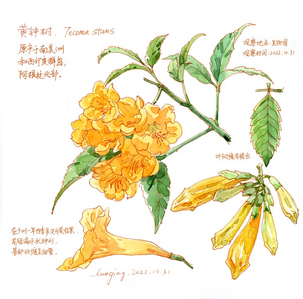 黄钟花为紫葳科黄钟花属常绿灌木,拉丁名为Tecoma stans,Tecoma为属名黄钟花属;种加词stans意思是直立的,黄钟花的茎直立,在普遍较为“慵懒”的灌木丛中独树一帜,它原产南美和西印度群岛。