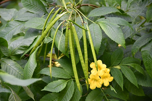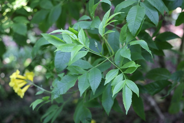 叶子对比:黄钟花为奇数羽状复叶;黄花风铃木为掌状复叶