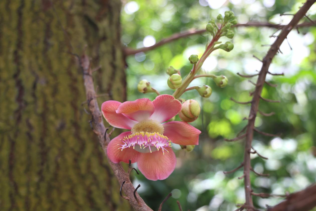 炮弹树,老茎生花植物,花序从树干上长出,长可达一米以上。花瓣浅碟状,粉红色。果实球形,茶褐色,似炮弹。