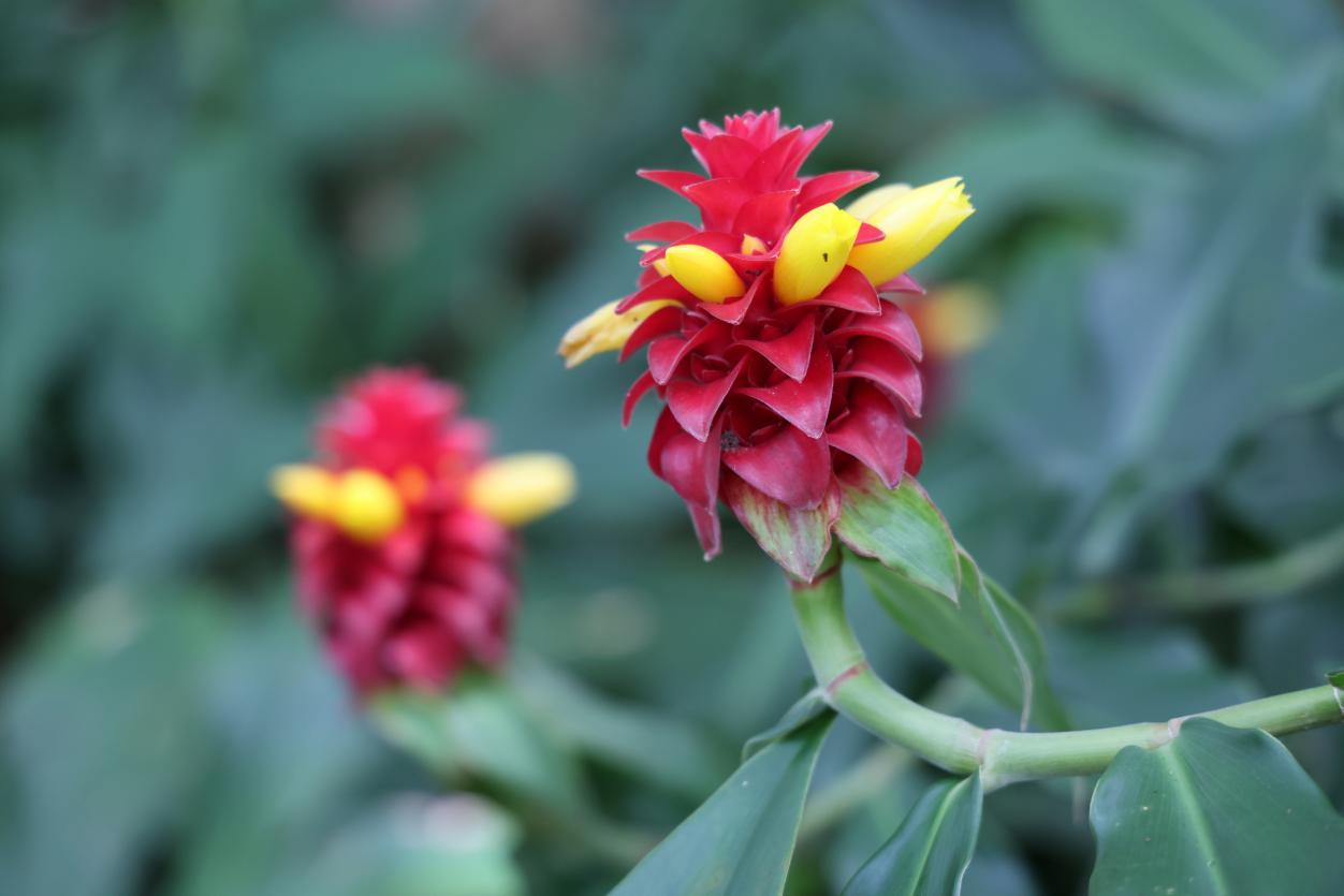 宝塔姜,花序呈塔状,深红色苞片,花金黄色如“象牙”。