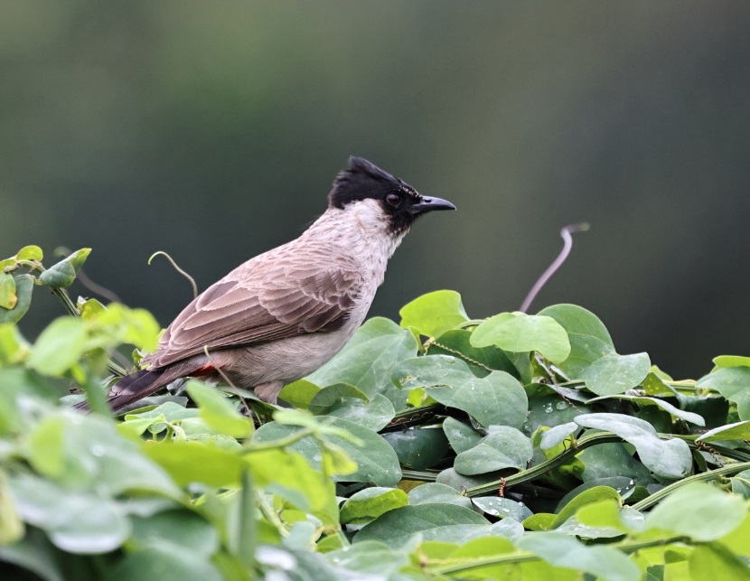白喉红臀鹎,和红耳鹎长得很像,红耳鹎羽冠耸立,戴“高帽”;白喉红臀鹎羽冠较短,戴的是“头罩”,白喉红臀鹎脸颊无红色。