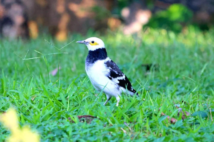黑领椋(liáng)鸟 ,一种脖子上好像戴着一条黑色围脖的鸟,眼周和脸颊黄色。常成对或成小群活动,鸣叫粗哑嘈杂。