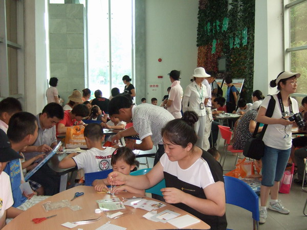 展示区,小朋友们在家长的陪同下,进行了“林中寻宝”游戏,首先由科普博士讲解员给孩子们介绍各种植物知识及植物叶的叶形、叶脉、叶缘、叶的排列方式等基础知识,随后孩子们利用掌握的知识寻找答案,从中感受到游戏的乐趣。在科普馆孩子们自己动手制作押花小卡片,他们利用干花、干枝、干叶等植物材料,充分发挥自己的想象,创作一幅作品。孩子们纷纷自己动手完成创作,有些孩子则把自己亲手制作的小卡片送给老师和同学,他们希望下次再来做不同的图案,孩子们从中感受到自己动手的乐趣。