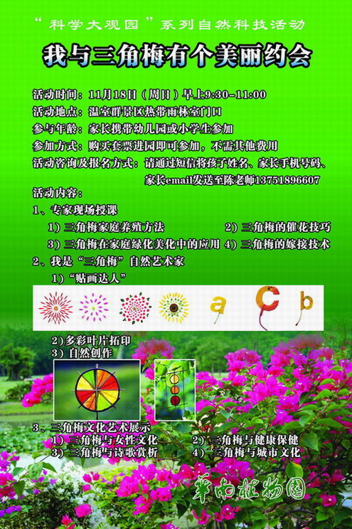 11月18日,我们诚挚邀请您走进华南植物园,参加一年一度的三角梅花展及“我与三角梅有个美丽约会”科普活动。在欣赏大自然所赐美丽的同时,您会发现,三角梅还给我们带来了意想不到的的身心感受和美好体验。