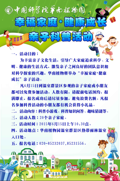 为丰富亲子文化生活,引导广大家庭追求科学、文明、健康的生活方式,激发亲子之间良好的团队意识和对科学探索的兴趣,华南植物将举办“幸福家庭·健康成长”亲子活动。