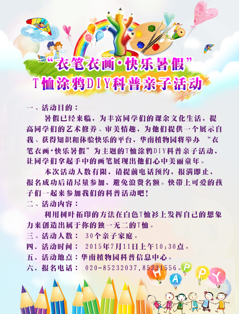 暑假已经来临,为丰富同学们的课余文化生活,提高同学们的艺术修养、审美情趣,为他们提供一个展示自我、获得知识和体验快乐的平台,华南植物园将举办 “衣笔衣画·快乐暑假”为主题的T恤涂鸦DIY科普亲子活动,让同学们拿起手中的画笔展现出他们心中美丽童年。
