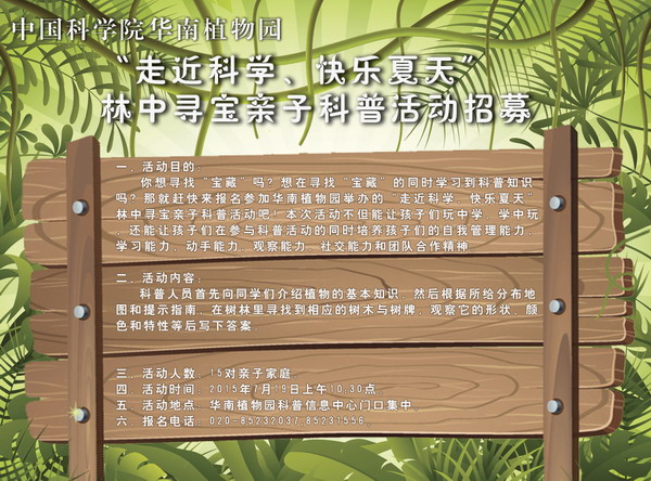 你想寻找“宝藏”吗?想在寻找“宝藏”的同时学习到科普知识吗?那就赶快来报名参加华南植物园举办的“走近科学、快乐夏天” 林中寻宝亲子科普活动吧!本次活动不但能让孩子们玩中学、学中玩,还能让孩子们在参与科普活动的同时培养孩子们的自我管理能力,学习能力,动手能力,观察能力,社交能力和团队合作精神。