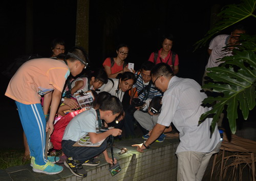 的确眼前的一切是作为80后父母儿时的玩伴之一,对于80后来说我们童年不但只有超级玛丽、弹珠、跳绳等,还有无处不在的小昆虫小动物们。眼前的一切也让作为大人的我们回到短暂的童年时光。我们小时候也玩虫子,从不害怕不顾后果的直接捉到手上玩,所以常常要承担“一身包”的结果,悲哀的遇到有毒的昆虫。不会像现在孩子们有指导老师跟你说那些有毒不能摸,那些没毒在老师的指导下可以摸。围捕青蛙是雨后必上一课,不过我们重来不知道会树蛙靠的是什么得意爬上树,“哞 哞 哞”如牛般叫的是花狭口蛙。在我们统一叫青蛙的时候,我们的孩子们却可以在郭世军老师的介绍下知道蛙跟蟾蜍这两种夜观常客的区别,还可以亲自跟广州市最小的蛙类饰纹姬蛙握个手。