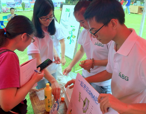活动现场,IABG(国际植物园协会)办公室策划的用日常用品洗洁精、食盐和酒精提取植物DNA的科普项目,深受广大市民的喜爱。在广州的烈日和高温下,华南植物园基因工程中心李勇青教授带领她的三位“学霸”弟子,博士研究生蔡佳佳、 硕士研究生邵珠佳和马小玲,现场演示如何提取香蕉、火龙果和奇异果DNA,引来很多参加者的驻足和围观。