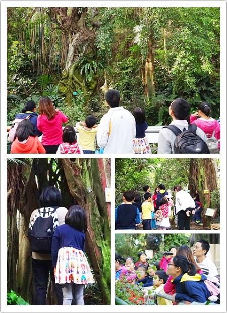 活动伊始,科普老师通过三个主题游戏向孩子们形象地介绍了小动物的演变过程、动植物之间的联系、食物链和食物网的定义以及动物界弱肉强食、适者生存的法则。而弱肉强食的生存法则不仅存在于动物界,植物界也不乏其例……老师带着孩子们走进神秘的热带雨林,观察雨林中的各种植物为了生存而使出的种种招数。孩子们观察发现细叶榕为了抢夺地盘用枝干上长出的气生根绞杀其它植物,对于绞杀后形成的空心树惊叹不已。尔后,老师又围绕植物界为什么会有绞杀现象、植物是如何绞杀、绞杀植物的种类等多个问题,进行了耐心讲解和细致回答。
