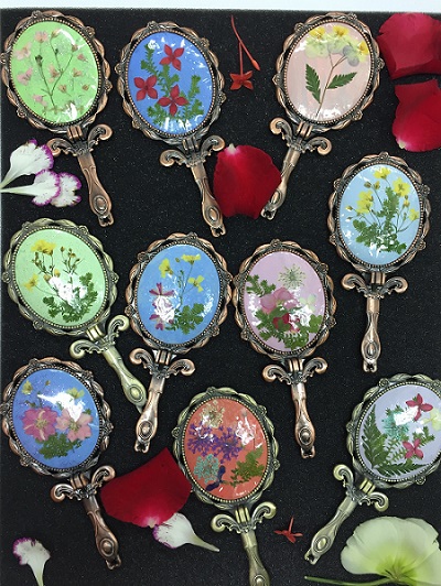 最受学员欢迎的环节到了——压花手镜的创作。老师教授大家利用丙烯颜料制作底色的方法,在金属凸面上上好底色,晾干后在金属凸面上设计构图,并固定花材及腹膜。学员们运用花材自然的状态序设计出一副副简约精美的画面,制作出独一无二的压花美妆镜。