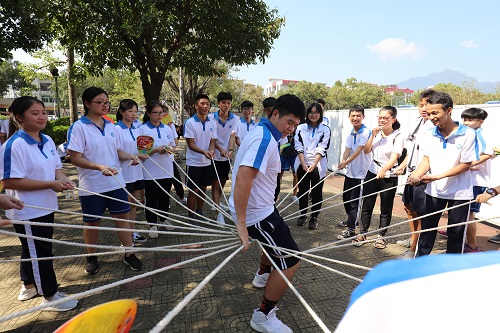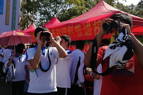 在活动会场上,保护区工作人员布置以“鼎湖山蛇类”、“鼎湖山常见鸟类”“鼎湖山珍稀濒危植物”的展板,通过展板展示,让同学们在校园中即可了解到鼎湖山丰富的动植物资源,陈列了鼎湖山珍稀昆虫标本供同学们近距离观察;鼎湖山保护区安排的互动体验环节给同学们带来了不一样的感官体验,在工作人员的指导下,同学们学会使用专业的观鸟望远镜寻找校园中的鸟儿,使用昆虫放大镜观察不同昆虫的特征,通过这些活动,引导学生们从不同的角度欣赏校园的自然环境;有趣的动植物猜谜引起了同学们极大的兴趣,同学们通过思考和讨论都能猜出相应的动植物。最后,工作人员与学生们一同开展“生态链”小游戏,让同学们玩着有趣游戏的同时了解生态圈的各个组成部分,明白人类只是生态圈中的一个“成员”,而不是生态圈的中心,在他们心中撒播爱护自然,与地球上其他生命和谐共处的种子。