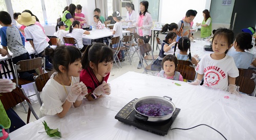 回到科学实验室,众人立刻化身小实验家,通过亲自动手来感受寓教于乐的欢快氛围。第一个小实验是神奇的水中花,孩子们先将纸花涂上颜色,将花瓣弯折后轻轻放入水中,透过纸纤维吸水膨胀的原理,过一会花瓣便缓缓打开,宛如开花的景象。紧接着是用红球甘蓝提取的植物色素来做变色小实验。需要通过熬煮红球甘蓝,来提取它色素啦。通过它的色素,在与醋、苏打水、碳酸水混合后,则会发生了神奇的化学反应——变颜色。随着实验进行,大家积极的动手实践,并和身边的小伙伴一同交流互动。在溶液混合发生颜色变化的那一刻,大家发出惊叹的声音,更有小朋友开始尝试更多试验,通过控制溶液比例,来尝试调配出不同的颜色。