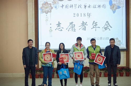 为了表彰志愿者的奉献与付出,年会特别设立了木棉花奖、无忧花奖和翡翠葛奖,分别表彰总服务时长前31名的优秀志愿者。还颁发了特别贡献奖,褒奖5位作出特殊贡献的志愿者:他们是温室组的陈涛、数据处理组的韦桂峰、讲解导览组的范小静、文字摄影组的徐晔春以及旅游服务组的周启明。