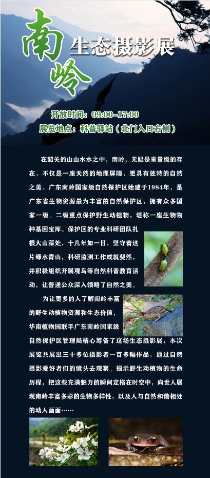 为让更多的人了解南岭丰富的野生动植物资源和生态价值,华南植物园联手广东南岭国家级自然保护区管理局精心筹备了这场生态摄影展,本次展览共展出三十多位摄影者共计一百多幅作品。通过自然摄影爱好者们的镜头去观察、揭示野生动植物的生命历程,把这些充满魅力的瞬间定格在时空中,向世人展现南岭丰富多彩的生物多样性,以及人与自然和谐相处的动人画面!