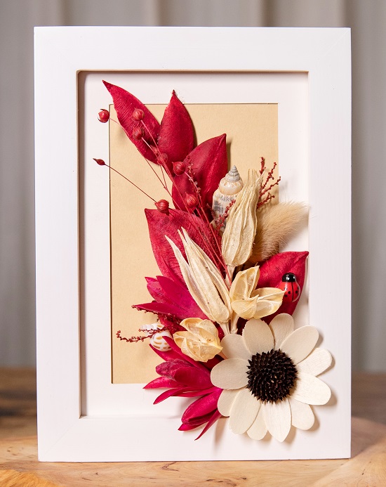 制作材料:玉兰干花、黑心菊干花、泡桐果果壳、秋葵果实、相思豆、情人草干花、兔尾草、热熔胶枪、枝剪、海螺、仿真昆虫、相框。