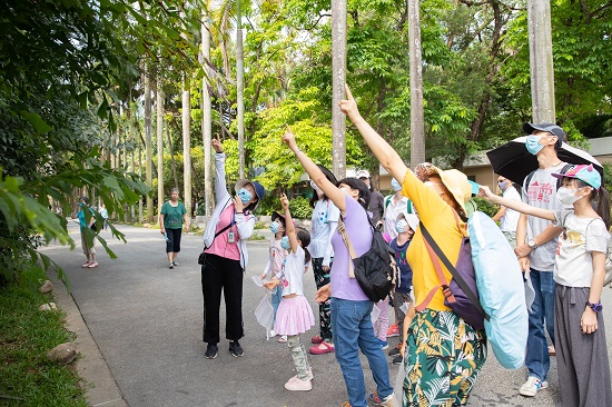 认识有趣植物——短穗鱼尾葵。它和我们熟知的椰子是亲戚,同为棕榈科成员。它的叶子长得像鱼的尾巴,故名。短穗鱼尾葵在茎上长出的一串串花序引起了大家的兴趣,纷纷抬起头来欣赏与观察。此外,短穗鱼尾葵茎的髓心富含淀粉,可供食用;花序中的汁液富含糖分,可以用来制糖或者酿酒。