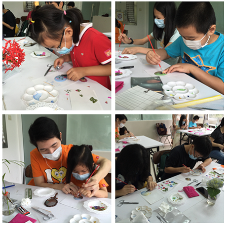 但偶尔一低头,发现地上零落成泥香犹在的翻白叶树和人面果树的花时,不禁让人感慨"无可奈何花落去","最是人间留不住"。如何才能永远留住这些与花儿相遇的最美丽时刻呢?那就让我们回到室内,跟柯老师学习定格美丽的压花艺术吧。压花艺术是一门釆用物理或化学的方法将鲜花处理、干燥保存并进行艺术创作的技术,是定格自然美丽的艺术。在制作和创作过程中,能够让人收获专注快乐、宁静平和以及满满的成就感。柯老师先介绍了压花艺术的起源、概况,花材的采集。压制和干花的着色保色等。接下来重点教授和指导学员如何制作精美的独一无二的压花手镜。从如何选用丙烯颜料调色涂底色,到怎样构图选材、粘花成画、压膜定型等一一道来,耐心指导。面对已事先压制好但色韵仍然娇逸美丽的各种花材,学员们兴致浓郁、专注地进入了创作的乐趣中,特别是小学员们也表现出与年龄不相符的专注和耐心。印象最深便是有个可爱的小学员想上卫生间却又怕错过了老师的精彩演示,一再叮嘱老师要等她回来再继续。